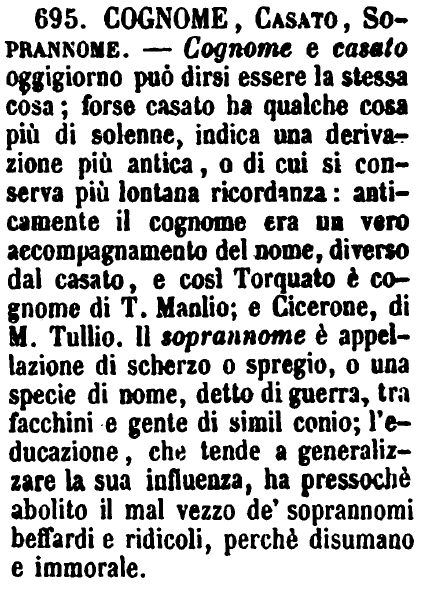 | Nome, Cognome, Casato, Soprannome - Nome è quello che si pone all'atto del battesimo. - Il Cognome è quello che già si prese la famiglia, e che non si muta; e se parlasi di gente di buona condizione, si chiama Casato. - Alle volte, o per un fatto speciale, o per certe particolarità, si dà altrui un appellativo che le ricordi, e che si sostituisce al nome, e quello è il Soprannome. [immagine] |