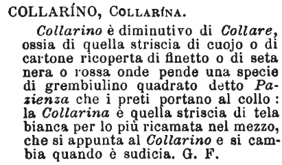 | Collarino, Collarina - Collarino è diminutivo di Collare, ossia di quella striscia di cuojo o di cartone ricoperta di finetto o di seta nera o rossa onde pende una specie di grembiulino quadrato detto Pazienza che i preti portano al collo: la Collarina è quella striscia di tela bianca per lo più ricamata nel mezzo, che si appunta al Collarino e si cambia quando è sudicia. G. F. [immagine] |