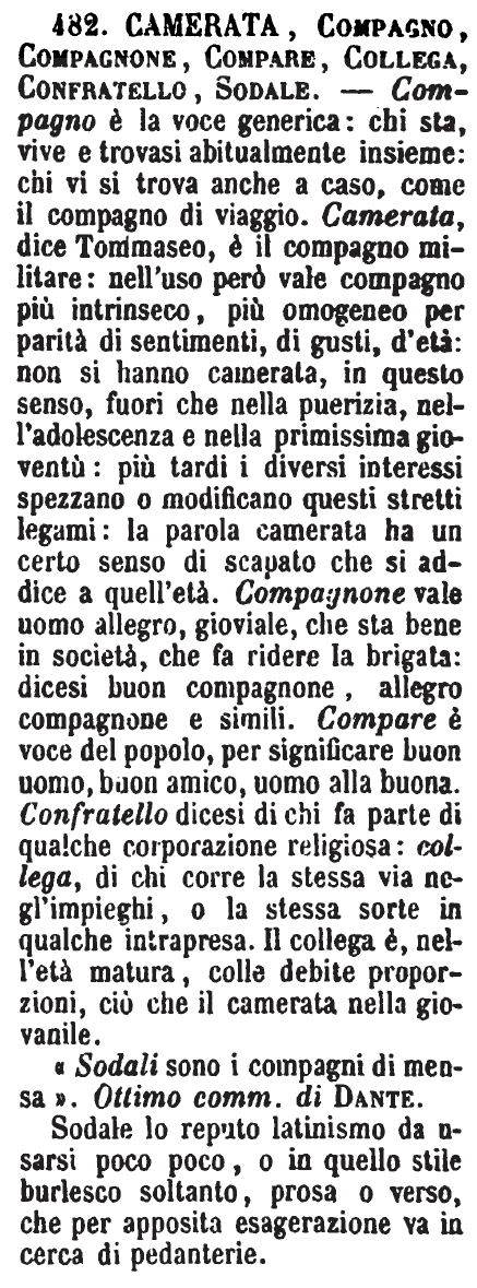Camerata, Compagno, Compagnone, Compare, Collega, Confratello, Sodale - Compagno è la voce generica: chi sta, vive e trovasi abitualmente insieme: chi vi si trova anche a caso, come il compagno di viaggio. Camerata, dice Tommaseo, è il compagno militare: nell'uso però vale compagno più intrinseco, più omogeneo per parità di sentimenti, di gusti, d'età: non si hanno camerata, in questo senso, fuori che nella puerizia, nell'adolescenza e nella primissima gioventù: più tardi i diversi interessi spezzano o modificano questi stretti legami: la parola camerata ha un certo senso di scapato che si addice a quell'età. Compagnone vale uomo allegro, gioviale, che sta bene in società, che fa ridere la brigata: dicesi buon compagnone, allegro compagnone e simili. Compare è voce del popolo, per significare buon uomo, buon amico, uomo alla buona. Confratello dicesi di chi fa parte di qualche corporazione religiosa: collega, di chi corre la stessa via negl'impieghi, o la stessa sorte in qualche intrapresa. Il collega è, nell'età matura, colle debite proporzioni, ciò che il camerata nella giovanile.