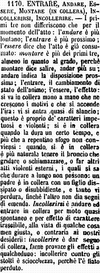 | Entrare, Andare, Essere, Montare (in collera), Incollerirsi, Incollerire - I primi tre non differiscono che per il momento dell'atto: l'andare è più lontano; l'entrare è più prossimo; l'essere dice che l'atto è già consumato: montare è più dei primi tre, almeno in quanto al grado, perchè montare dice salire, andar più su; andare indica la disposizione prossima; l'entrare, il cambiamento di stato dell'animo; l'essere, l'effetto: si va in collera mano a mano che ne crescono i motivi e che si accende l'ira: vi si entra quasi di slancio; questo è proprio de' caratteri impetuosi e violenti; si è in collera quando la dura un certo tempo, e più che repentino sfogo non conviensi: quando si è in collera è più naturale tenere il broncio che gridare o schiamazzare, o far altri atti violenti esterni, i quali si sa che durare a lungo non possono: un padre è in collera con un figlio dissipato o disubbidiente, e tanto vi perdura, finchè l'altro non dia segni di emenda. Incollerirsi è andare ed entrare in collera per moto quasi spontaneo e per effetto di carattere irascibile, alla vista di qualche cosa men giusta, o contraria ai nostri desiderii: incollerire è dar segno di collera, farne provare gli effetti a qualcheduno: incollerire contro gli stolti è sciocchezza, perchè l'è fiato perduto. [immagine] |