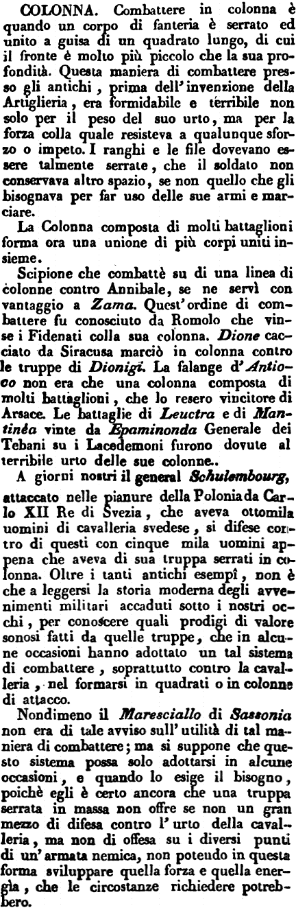 | Colonna - Combattere in colonna è quando un corpo di fanteria è serrato ed unito a guisa di un quadrato lungo, di cui il fronte è molto più piccolo che la sua profondità. Questa maniera di combattere presso gli antichi, prima dell'invenzione della Artiglieria, era formidabile e terribile non solo per il peso del suo urto, ma per la forza colla quale resisteva a qualunque sforzo o impeto. I ranghi e le file dovevano essere talmente serrate, che il soldato non conservava altro spazio, se non quello che gli bisognava per far uso delle sue armi e marciare.