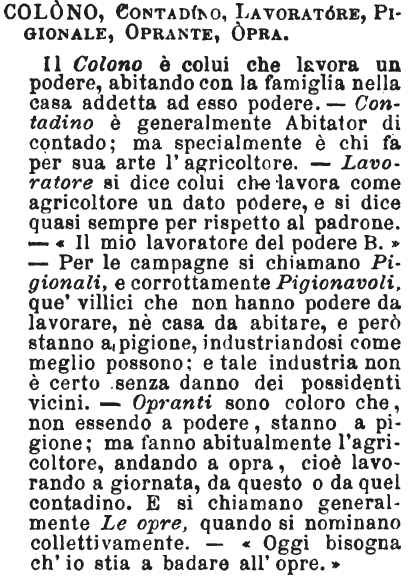 | Colono, Contadino, Lavoratore, Pigionale, Oprante, Opra - Il Colono è colui che lavora un podere, abitando con la famiglia nella casa addetta ad esso podere. - Contadino è generalmente Abitator di contado; ma specialmente è chi fa per sua arte l'agricoltore. - Lavoratore si dice colui che lavora come agricoltore un dato podere, e si dice quasi sempre per rispetto al padrone. - «Il mio lavoratore del podere B.» - Per le campagne si chiamano Pigionali, e corrottamente Pigionavoli, que' villici che non hanno podere da lavorare, nè casa da abitare, e però stanno a pigione, industriandosi come meglio possono: e tale industria non è certo senza danno dei possidenti vicini. - Opranti sono coloro che, non essendo a podere, stanno a pigione; ma fanno abitualmente l'agricoltore, andando a opra, cioè lavorando a giornata, da questo o da quel contadino. E si chiamano generalmente Le opre, quando si nominano collettivamente. - «Oggi bisogna ch'io stia a badare all'opre.» [immagine] |