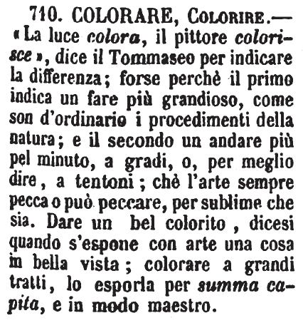 Colorare, Colorire - «La luce colora, il pittore colorisce», dice il Tommaseo per indicare la differenza; forse perchè il primo indica un fare più grandioso, come son d'ordinario i procedimenti della natura; e il secondo un andare più pel minuto, a gradi, o, per meglio dire, a tentoni; chè l'arte sempre pecca o può peccare, per sublime che sia. Dare un bel colorito, dicesi quando s'espone con arte una cosa in bella vista; colorare a grandi tratti, lo esporla per summa capita, e in modo maestro. [immagine]