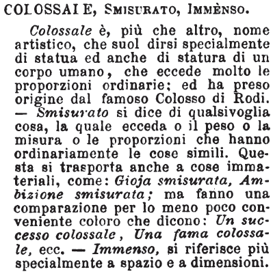 | Colossale, Smisurato, Immenso - Colossale è, più che altro, nome artistico, che suol dirsi specialmente di statua ed anche di statura di un corpo umano, che eccede molto le proporzioni ordinarie; ed ha preso origine dal famoso Colosso di Rodi. - Smisurato si dice di qualsivoglia cosa, la quale ecceda o il peso o la misura o le proporzioni che hanno ordinariamente le cose simili. Questa si trasporta anche a cose immateriali, come: Gioja smisurata, Ambizione smisurata; ma fanno una comparazione per lo meno poco conveniente coloro che dicono: Un successo colossale, Una fama colossale, ecc. - Immenso, si riferisce più specialmente a spazio e a dimensioni. [immagine] |