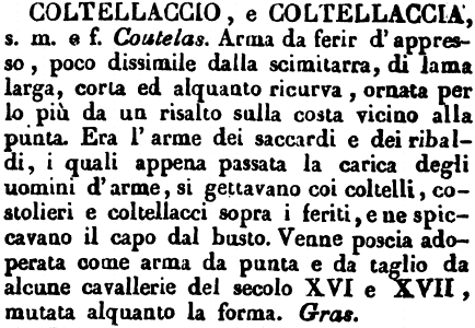 | Coltellaccio, e Coltellaccia - s. m. e f. Coutelas. Arma da ferir d'appresso, poco dissimile dalla scimitarra, di lama larga, corta ed alquanto ricurva, ornata per lo più da un risalto sulla costa vicino alla punta. Era l'arme dei saccardi e dei ribaldi, i quali appena passata la carica degli uomini d'arme, si gettavano coi coltelli, costolieri e coltellacci sopra i feriti, e ne spiccavano il capo dal busto. Venne poscia adoperata come arma da punta e da taglio da alcune cavallerie del secolo XVI e XVII, mutata alquanto la forma. Gras. [immagine] |