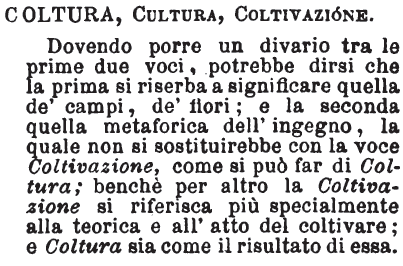 | Coltura - S. f. Coltivamento. Aureo lat. M. V. 2. 61. (C) Tanto si disusarono i campi della coltura, tanto si consumarono i frutti ricolti, che…
