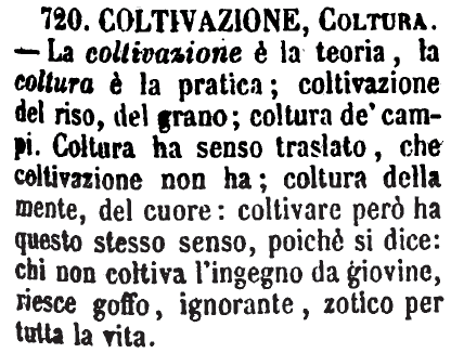 | Coltivazione, Coltura - La coltivazione è la teoria, la coltura è la pratica; coltivazione del riso, del grano; coltura de' campi. Coltura ha senso traslato, che coltivazione non ha; coltura della mente, del cuore: coltivare però ha questo stesso senso, poichè si dice: chi non coltiva l'ingegno da giovine, riesce goffo, ignorante, zotico per tutta la vita. [immagine] |