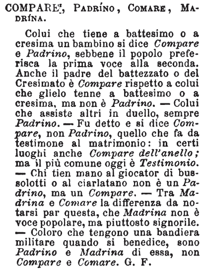 | Compare, Padrino, Comare, Madrina - Colui che tiene a battesimo o a cresima un bambino si dice Compare e Padrino, sebbene il popolo preferisca la prima voce alla seconda. Anche il padre del battezzato o del Cresimato è Compare rispetto a colui che glielo tenne a battesimo o a cresima, ma non è Padrino. - Colui che assiste altri in duello, sempre Padrino. - Fu detto e si dice Compare, non Padrino, quello che fa da testimone al matrimonio: in certi luoghi anche Compare dell'anello; ma il più comune oggi è Testimonio. - Chi tien mano al giocator di bussolotti o al ciarlatano non è un Padrino, ma un Compare. - Tra Madrina e Comare la differenza da notarsi par questa, che Madrina non è voce popolare, ma piuttosto signorile. - Coloro che tengono una bandiera militare quando si benedice, sono Padrino e Madrina di essa, non Compare e Comare. G. F. [immagine] |