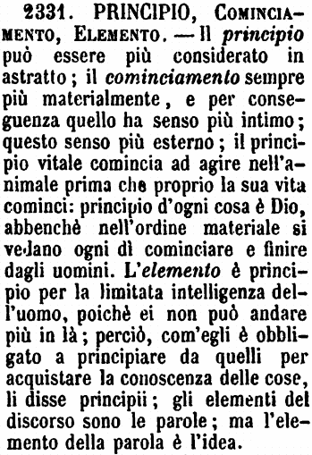 | Principio, Cominciamento, Elemento - Il principio può essere più considerato in astratto; il cominciamento sempre più materialmente, e per conseguenza quello ha senso più intimo; questo senso più esterno; il principio vitale comincia ad agire nell'animale prima che proprio la sua vita cominci: principio d'ogni cosa è Dio, abbenchè nell'ordine materiale si vedano ogni dì cominciare e finire dagli uomini. L'elemento è principio per la limitata intelligenza dell'uomo, poichè ei non può andare più in là; perciò, com'egli è obbligato a principiare da quelli per acquistare la conoscenza delle cose, li disse principii; gli elementi del discorso sono le parole; ma l'elemento della parola è l'idea. [immagine] |