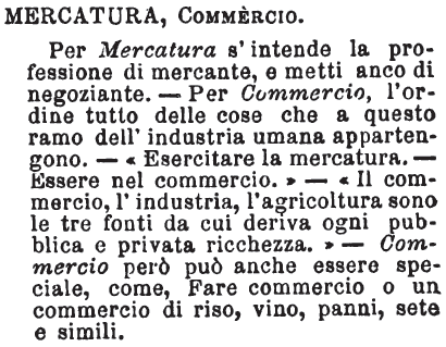 | Mercatura, Commercio - Per Mercatura s'intende la professione di mercante, e metti anco di negoziante. - Per Commercio, l'ordine tutto delle cose che a questo ramo dell'industria umana appartengono. - «Esercitare la mercatura. - Essere nel commercio.» - «Il commercio, l'industria, l'agricoltura sono le tre fonti da cui deriva ogni pubblica e privata ricchezza.» - Commercio però può anche essere speciale, come, Fare commercio o un commercio di riso, vino, panni, sete e simili. [immagine] |