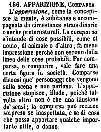 | Apparizione, Comparsa - L'apparizione, come la concepisce la mente, è subitanea e accompagnata da circostanze straordinarie o anche preternaturali. La comparsa s'intende di cose possibili, come di uomo, di animale o d'altro; fa meno impressione perchè non escono dalla linea delle cose probabili. Far comparsa, o comparire, vale fare una certa figura in società. Comparse diconsi que' personaggi che vengono sulla scena e non parlano. L'apparizione stupisce, illude, poichè talvolta altro non è che una illusione de' sensi; la comparsa può recarne sorpresa se inaspettata, e se di cosa che possa apportare qualche importante utile, o danno. [immagine] |