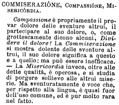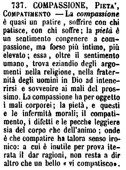| Commiserazione, Compassione, Misericordia - Compassione è propriamente il provar dolore delle sventure altrui, il partecipare al suo dolore, o, come grottescamente dicono alcuni, Dividere il dolore! La Commiserazione si mostra dolente delle sventure altrui, il suo dolore significa a questo e a quello; ma può essere inefficace. - La Misericordia invece, oltre alle dette qualità, è operosa, e si studia di porgere sollievo alle altrui miserie. Ma sventuratamente è voce che, per rispetto alla lingua, è quasi fuor dell'uso comune, ed è pur molto rara nel fatto. [immagine] |