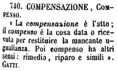 | Compensazione, Compenso - « La compensazione è l'atto; il compenso è la cosa data o ricevuta per restituire la mancante ugualianza. Poi compenso ha altri sensi: rimedio, riparo e simili ». Gatti. [immagine] |
