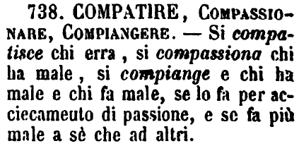 | Compatire, Compassionare, Compiangere - Si compatisce chi erra, si compassiona chi ha male, si compiange e chi ha male e chi fa male, se lo fa per acciecamento di passione, e se fa più male a sè che ad altri. [immagine] |