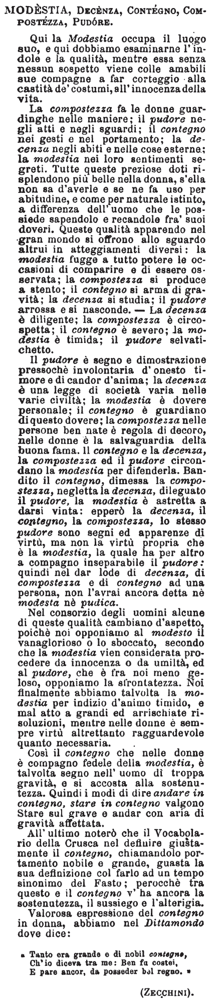 | Modestia, Decenza, Contegno, Compostezza, Pudore - Qui la Modestia occupa il luogo suo, e qui dobbiamo esaminarne l'indole e la qualità, mentre essa senza nessun sospetto viene colle amabili sue compagne a far corteggio alla castità de' costumi, all'innocenza della vita.