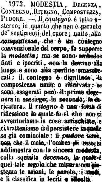 | Modestia, Decenza, Contegno, Ritegno, Compostezza, Pudore - Il contegno è tutto esterno; in quanto che non è garante de' sentimenti del cuore; unito alla compostezza, che è un contegno convenzionale del corpo, fa supporre la modestia; ma se sono ambedue finti e ipocriti, non la durano alla lunga e sono alla perfine smascherati; il contegno è dignitoso, la compostezza umile o riservata: se sono esagerati però il primo degenera in sussiego; la seconda, in caricatura. Il ritegno è una forza di riflessione la quale fa sì che non ci avventuriamo in cose arrischiate, e ci tratteniamo dal persistere in quelle se già cominciate: il pudore teme, non che il male, l'ombra di esso, si addimostra con la sincera modestia, colla squisita decenza, la quale è quel tale regolo che misura con giustezza le azioni, le parole, i modi, e li classifica in leciti e illeciti. [immagine] |