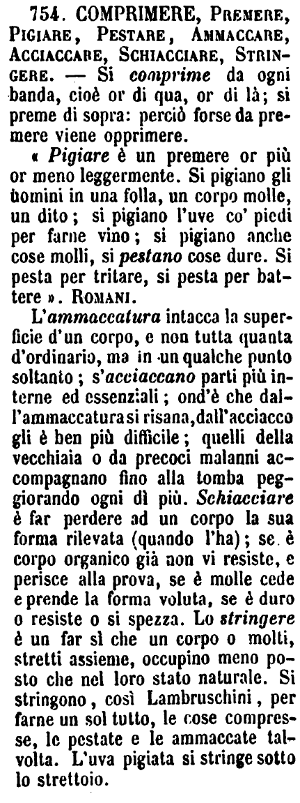 « Pigiare è un premere or più or meno leggermente. Si pigiano gli uomini in una folla, un corpo molle, un dito; si pigiano l'uve co' piedi per farne vino; si pigiano anche cose molli, si pestano cose dure. Si pesta per tritare, si pesta per battere ». Romani. L'ammaccatura intacca la superficie d'un corpo, e non tutta quanta d'ordinario, ma in un qualche punto soltanto; s'acciaccano parti più interne ed essenziali; ond'è che dall'ammaccatura si risana, dall'acciacco gli è ben più difficile; quelli della vecchiaia o da precoci malanni accompagnano fino alla tomba peggiorando ogni dì più. Schiacciare è far perdere ad un corpo la sua forma rilevata (quando l'ha); se è corpo organico già non vi resiste, e perisce alla prova, se è molle cede e prende la forma voluta, se è duro o resiste o si spezza. Lo stringere è un far sì che un corpo o molti, stretti assieme, occupino meno posto che nel loro stato naturale. Si stringono, così Lambruschini, per farne un sol tutto, le cose compresse, le pestate e le ammaccate talvolta. L'uva pigiata si stringe sotto lo strettoio. [immagine] |
