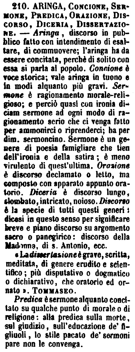 | Aringa, Concione, Sermone, Predica, Orazione, Discorso, Diceria, Dissertazione - Aringa, discorso in pubblico fatto con intendimento di esaltare, di commuovere; l'aringa ha da essere concitata, perché di solito con essa si parla al popolo. Concione è voce storica; vale aringa in tuono e in modi alquanto più gravi. Sermone è ragionamento morale-religioso; e perciò quasi con ironia diciam sermone ad ogni modo di ragionamento serio che ci venga fatto per ammonirci o riprenderci; ha per dim. sermoncino. Sermone è un genere di poesia famigliare che tien dell'ironia e della satira; è meno virulento di quest'ultima. Orazione è discorso declamato o letto, ma composto con apparato appunto oratorio. Diceria è discorso lungo, slombato, intricato, noioso. Discorso è la specie di tutti questi generi: dicesi in questo senso per significare breve e piano discorso su argomento sacro o panegirico: discorso della Madonna, di s. Antonio, ecc.