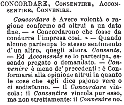 | Concordare, Consentire, Acconsentire, Convenire - Concordare è Avere volontà e ragione conforme ad altrui a un dato fine. - «Concordarono che fosse da condurre l'impresa così.» - Quando alcuno partecipa lo stesso sentimento d'un altro, quegli allora Consente. - Ed Acconsente se lo partecipa, essendo pregato o domandato. - Convenire è meno de' precedenti: è Conformarsi alla opinione altrui in quanto le cose che egli dice pajono vere o ci sodisfanno. - Il Concordare vincola: Il Consentire vincola pur esso, ma non strettamente: il Convenire no. [immagine] |
