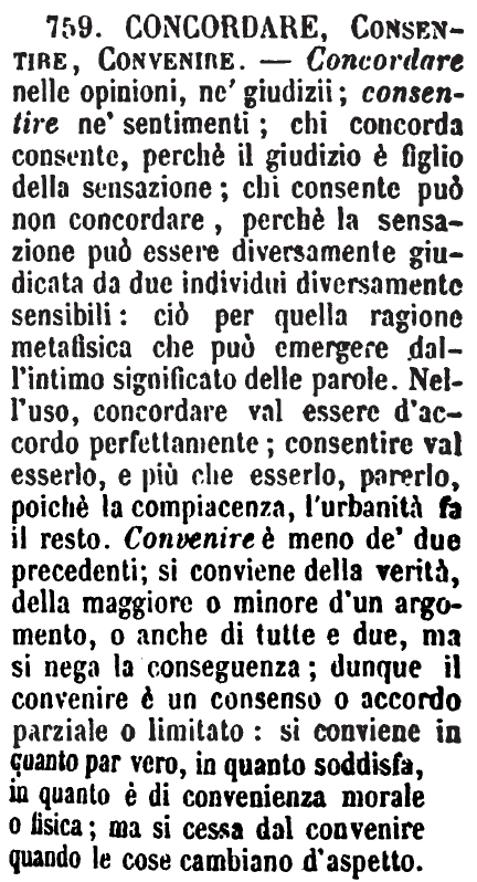 | Concordare, Consentire, Convenire - Concordare nelle opinioni, ne' giudizii; consentire ne' sentimenti; chi concorda consente, perché il giudizio è figlio della sensazione; chi consente può non concordare, perché la sensazione può essere diversamente giudicata da due individui diversamente sensibili: ciò per quella ragione metafisica che può emergere dall'intimo significato delle parole. Nell'uso, concordare val essere d'accordo perfettamente; consentire val esserlo, e più che esserlo, parerlo, poiché la compiacenza, l'urbanità fa il resto. Convenire è meno de' due precedenti; si conviene della verità, della maggiore o minore d'un argomento, o anche di tutte e due, ma si nega la conseguenza; dunque il convenire è un consenso o accordo parziale o limitato: si conviene in quanto par vero, in quanto soddisfa, in quanto è di convenienza morale o fisica; ma si cessa dal convenire quando le cose cambiano d'aspetto. [immagine] |
