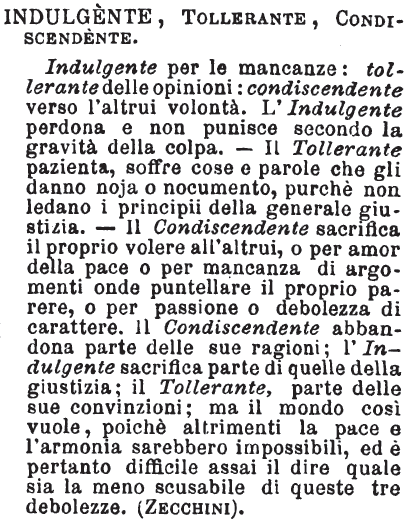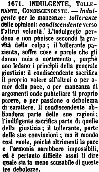 | Indulgente, Tollerante, Condiscendente - Indulgente per le mancanze: tollerante delle opinioni: condiscendente verso l'altrui volontà. L'indulgente perdona e non punisce secondo la gravità della colpa; il tollerante pazienta, soffre cose e parole che gli danno noia e nocumento, purchè non ledano i principii della generale giustizia: il condiscendente sacrifica il proprio volere all'altrui o per amor della pace, o per mancanza di argomenti onde puntellare il proprio parere, o per passione o debolezza di carattere. Il condiscendente abbandona parte delle sue ragioni; l'indulgente sacrifica parte di quelle della giustizia; il tollerante, parte delle sue convinzioni; ma il mondo così vuole, poichè altrimenti la pace e l'armonia sarebbero impossibili, ed è pertanto difficile assai il dire quale sia la meno scusabile di queste tre debolezze. [immagine] |