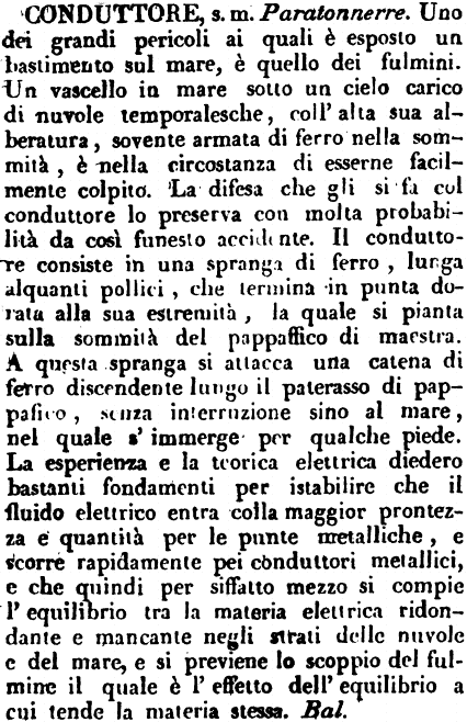 | Conduttore - s. m. Paratonnerre. Uno dei grandi pericoli ai quali è esposto un bastimento sul mare, è quello dei fulmini. Un vascello in mare sotto un cielo carico di nuvole temporalesche, coll'alta sua alberatura, sovente armata di ferro nella sommità, è nella circostanza di esserne facilmente colpito. La difesa che gli si fa col conduttore lo preserva con molta probabilità da così funesto accidente. Il conduttore consiste in una spranga di ferro, lunga alquanti pollici, che termina in punta dorata alla sua estremità, la quale si pianta sulla sommità del pappafico di maestra. A questa spranga si attacca una catena di ferro discendente lungo il paterasso di pappafico, senza interruzione sino al mare, nel quale s'immerge per qualche piede. La esperienza e la teorica elettrica diedero bastanti fondamenti per istabilire che il fluido elettrico entra colla maggior prontezza e quantità per le punte metalliche, e scorre rapidamente pei conduttori metallici, e che quindi per siffatto mezzo si compie l'equilibrio tra la materia elettrica ridondante e mancante negli strati delle nuvole e del mare, e si previene lo scoppio del fulmine il quale è l'effetto dell'equilibrio a cui tende la materia stessa. Bal. [immagine] |