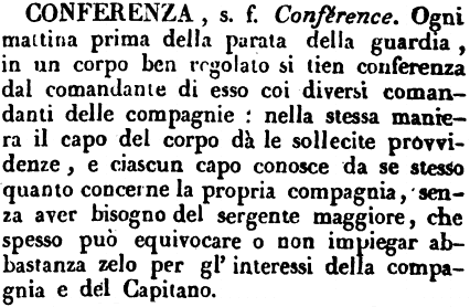 | Conferenza - s. f. Conférence. Ogni mattina prima della parata della guardia, in un corpo ben regolato si tien conferenza dal comandante di esso coi diversi comandanti delle compagnie: nella stessa maniera il capo del corpo dà le sollecite provvidenze, e ciascun capo conosce da se stesso quanto concerne la propria compagnia, senza aver bisogno del sergente maggiore, che spesso può equivocare o non impiegar abbastanza zelo per gl'interessi della compagnia e del Capitano. [immagine] |
