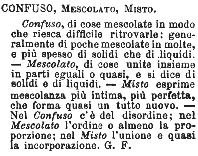 | Confuso, Mescolato, Misto - Confuso, di cose mescolate in modo che riesca difficile ritrovarle; generalmente di poche mescolate in molte, e più spesso di solidi che di liquidi. - Mescolato, di cose unite insieme in parti eguali o quasi, e si dice di solidi e di liquidi. - Misto esprime mescolanza più intima, più perfetta, che forma quasi un tutto nuovo. - Nel Confuso c'è del disordine; nel Mescolato l'ordine o almeno la proporzione; nel Misto l'unione e quasi la incorporazione. G. F. [immagine] |