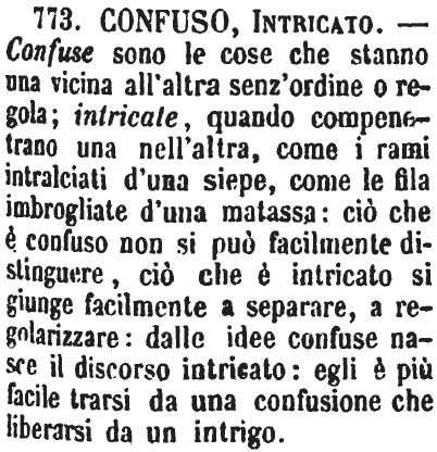 | Confuso, Intricato - Confuse sono le cose che stanno una vicino all'altra senz'ordine o regola; intricate, quando compenetrano una nell'altra, come i rami intralciati d'una siepe, come le fila imbrogliate d'una matassa: ciò che è confuso non si può facilmente distinguere, ciò che è intricato si giunge facilmente a separare, a regolarizzare: dalle idee confuse nasce il discorso intricato: egli è più facile trarsi da una confusione che liberarsi da un intrigo. [immagine] |