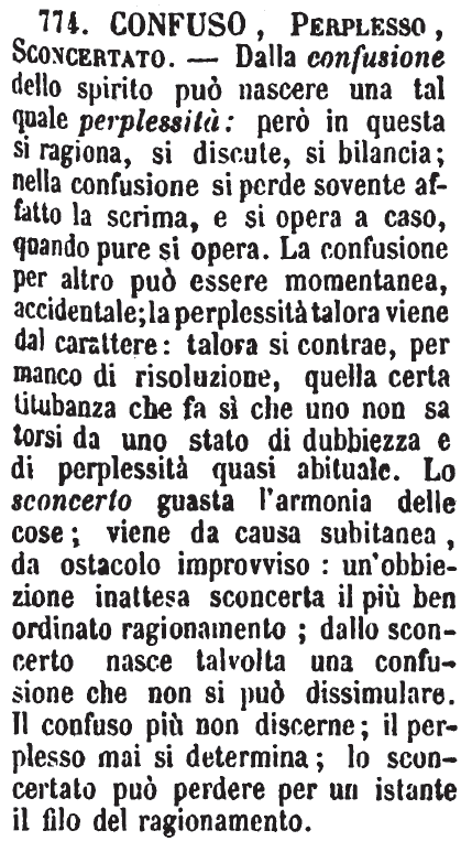 | Confuso, Perplesso, Sconcertato - Dalla confusione dello spirito può nascere una tal quale perplessità: però in questa si ragiona, si discute, si bilancia; nella confusione si perde sovente affatto la scrima, e si opera a caso, quando pure si opera. La confusione per altro può essere momentanea, accidentale; la perplessità talora viene dal carattere: talora si contrae, per manco di risoluzione, quella certa titubanza che fa sì che uno non sa torsi da uno stato di dubbiezza e di perplessità quasi abituale. Lo sconcerto guasta l'armonia delle cose; viene da causa subitanea, da ostacolo improvviso: un'obbiezione inattesa sconcerta il più ben ordinato ragionamento; dallo sconcerto nasce talvolta una confusione che non si può dissimulare. Il confuso più non discerne; il perplesso mai si determina; lo sconcertato può perdere per un istante il filo del ragionamento. [immagine] |