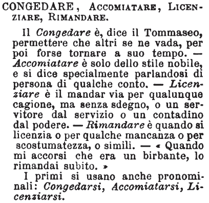 I primi si usano anche pronominali: Congedarsi, Accomiatarsi, Licenziarsi. [immagine] |