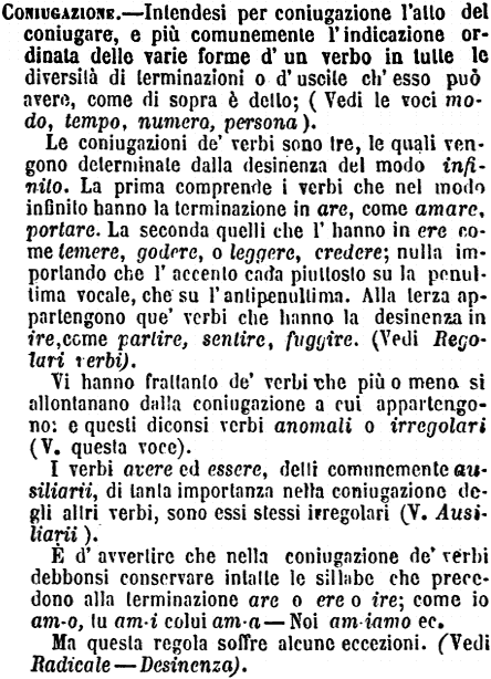 Le coniugazioni de' verbi sono tre, le quali vengono determinate dalla desinenza del modo infinito. La prima comprende i verbi che nel modo infinito hanno la terminazione in are, come amare, portare. La seconda quelli che l'hanno in ere come temere, godere, o leggere, credere; nulla importando che l'accento cada piuttosto su la penultima vocale, che su l'antipenultima. Alla terza appartengono que' verbi che hanno la desinenza in ire, come partire, sentire, fuggire. (Vedi Regolari verbi). Vi hanno frattanto de' verbi che più o meno si allontanano dalla coniugazione a cui appartengono: e questi diconsi verbi anomali o irregolari (V. questa voce). I verbi avere ed essere, detti comunemente ausiliarii, di tanta importanza nella coniugazione degli altri verbi, sono essi stessi irregolari (V. Ausiliarii). E' d'avvertire che nella coniugazione de' verbi debbonsi conservare intatte le sillabe che precedono alla terminazione are o ere o ire; come io am-o, tu am-i colui am-a - Noi am-iamo ec. Ma questa regola soffre alcune eccezioni. (Vedi Radicale - Desinenza). [immagine] |