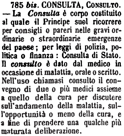 | Consulto, Consulta - I dottori in legge e in medicina dánno, fanno e scrivono Consulti: a consulta siedono generalmente i magistrati o gli uomini di Stato. - Consulta vale anche Quel magistrato che ha per uffizio di dar consiglio intorno a cose d'amministrazione o giudiciali. - «Consulta di Stato. - La Sacra Consulta.» - «Chirurgo che si fa pagar salati i suoi consulti.» - «I consulti del Redi e del Cocchi son testi di lingua.» G. F. [immagine] |