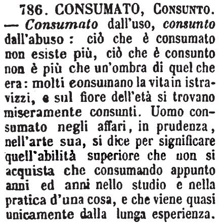 | Consumato, Consunto - Consumato dall'uso, consunto dall'abuso: ciò che è consumato non esiste più, ciò che è consunto non è più che un'ombra di quel che era: molti consumano la vita in istravizzi, e sul fiore dell'età si trovano miseramente consunti. Uomo consumato negli affari, in prudenza, nell'arte sua, si dice per significare quell'abilità superiore che non si acquista che consumando appunto anni ed anni nello studio e nella pratica d'una cosa, e che viene quasi unicamente dalla lunga esperienza. [immagine] |