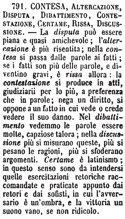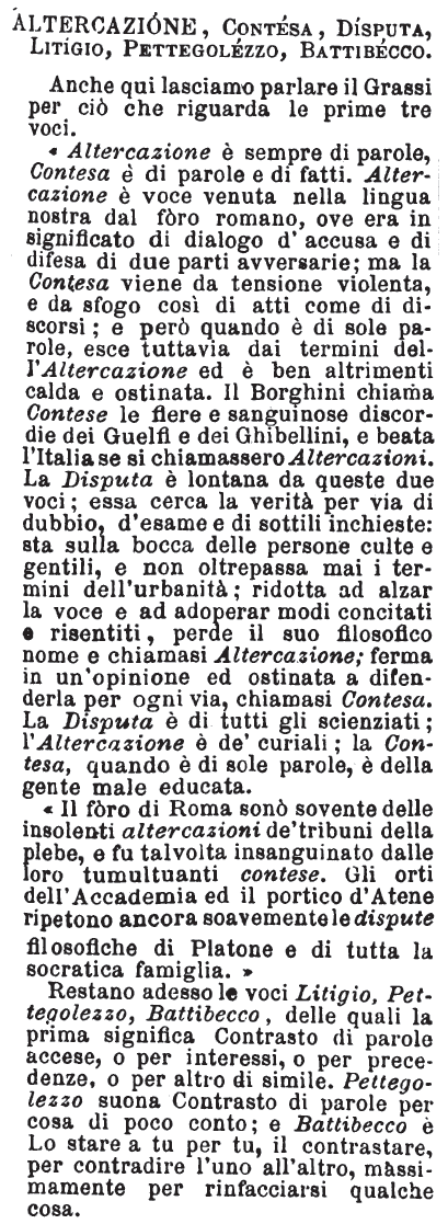 « Altercazione è sempre di parole, Contesa è di parole e di fatti. Altercazione è voce venuta nella lingua nostra dal fòro romano, ove era in significato di dialogo d'accusa e di difesa di due parti avversarie; ma la Contesa viene da tensione violenta, e da sfogo così di atti come di discorsi; e però quando è di sole parole, esce tuttavia dai termini dell'Altercazione ed è ben altrimenti calda e ostinata. Il Borghini chiama Contese le fiere e sanguinose discordie dei Guelfi e dei Ghibellini, e beata l'Italia se si chiamassero Altercazioni. La Disputa è lontana da queste due voci; essa cerca la verità per via di dubbio, d'esame e di sottili inchieste: sta sulla bocca delle persone culte e gentili, e non oltrepassa mai i termini dell'urbanità; ridotta ad alzar la voce e ad adoperar modi concitati e risentiti, perde il suo filosofico nome e chiamasi Altercazione; ferma in un'opinione ed ostinata a difenderla per ogni via, chiamasi Contesa. La Disputa è di tutti gli scienziati; l'Altercazione è de' curiali; la Contesa, quando è di sole parole, è della gente male educata.