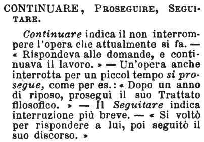 | Continuare, Proseguire, Seguitare - Continuare indica il non interrompere l'opera che attualmente si fa. - «Rispondeva alle domande, e continuava il lavoro.» - Un'opera anche interrotta per un piccol tempo si prosegue, come per es.: «Dopo un anno di riposo, proseguì il suo Trattato filosofico.» - Il Seguitare indica interruzione più breve. - «Si voltò per rispondere a lui, poi seguitò il suo discorso.» [immagine] |