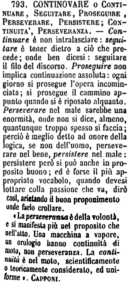 Continovare o Continuare, Seguitare, Proseguire, Perseverare, Persistere; Continuità, Perseveranza - Continuare è non intralasciare: seguitare è tener dietro a ciò che precede; onde ben dicesi: seguitare il filo del discorso. Proseguire non implica continuazione assoluta: ogni giorno si prosegue l'opera incominciata; si prosegue il cammino appunto quando si è riposato alquanto. Perseverare nel male sarebbe una enormità, onde non si dice, almeno, quantunque troppo spesso si faccia; perciò è meglio detto ad onore della logica, se non dell'uomo, perseverare nel bene, persistere nel male: persistere però si può anche in proposito buono; ed è forse il più appropriato vocabolo, quando devesi lottare colla passione che va, dirò così, arietando il buon proponimento onde farlo crollare.