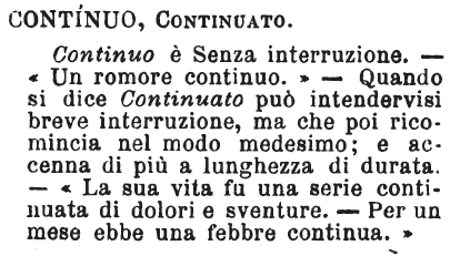 | Continuo, Continuato - Continuo è Senza interruzione. - «Un romore continuo.» - Quando si dice Continuato può intendervisi breve interruzione, ma che poi ricomincia nel modo medesimo; e accenna di più a lunghezza di durata. - «La sua vita fu una serie continuata di dolori e sventure. - Per un mese ebbe una febbre continua.» [immagine] |