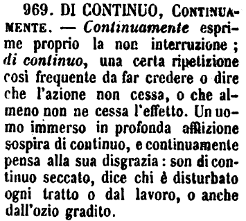 | Di continuo, Continuamente - Continuamente esprime proprio la non interruzione; di continuo, una certa ripetizione così frequente da far credere o dire che l'azione non cessa, o che almeno non ne cessa l'effetto. Un uomo immerso in profonda afflizione sospira di continuo, e continuamente pensa alla sua disgrazia: son di continuo seccato, dice chi è disturbato ogni tratto o dal lavoro, o anche dall'ozio gradito. [immagine] |