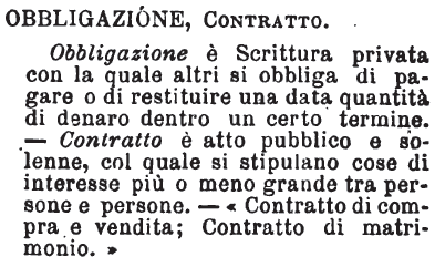 | Obbligazione, Contratto - Obbligazione è Scrittura privata con la quale altri si obbliga di pagare o di restituire una data quantità di denaro dentro un certo termine. - Contratto è atto pubblico e solenne, col quale si stipulano cose di interesse più o meno grande tra persone e persone. - «Contratto di compra e vendita; Contratto di matrimonio.» [immagine] |