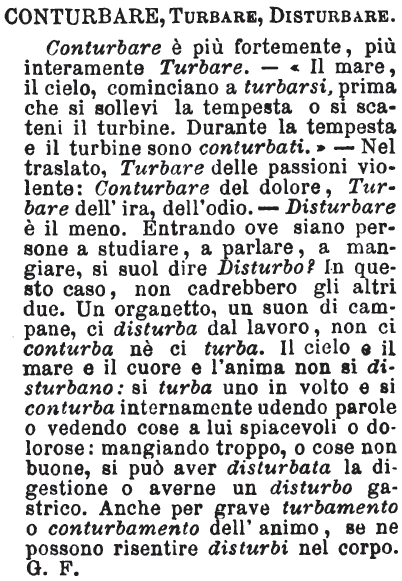 | Conturbare, Turbare, Disturbare - Conturbare è più fortemente, più interamente Turbare. - « Il mare, il cielo, cominciano a turbarsi, prima che si sollevi la tempesta o si scateni il turbine. Durante la tempesta e il turbine sono conturbati. » - Nel traslato, Turbare delle passioni violente: Conturbare del dolore, Turbare dell'ira, dell'odio. - Disturbare è il meno. Entrando ove siano persone a studiare, a parlare, a mangiare, si suol dire Disturbo? In questo caso, non cadrebbero gli altri due. Un organetto, un suon di campane, ci disturba dal lavoro, non ci conturba nè ci turba. Il cielo e il mare e il cuore e l'anima non si disturbano: si turba uno in volto e si conturba internamente udendo parole o vedendo cose a lui spiacevoli o dolorose: mangiando troppo, o cose non buone, si può aver disturbata la digestione o averne un disturbo gastrico. Anche per grave turbamento o conturbamento dell'animo, se ne possono risentire disturbi nel corpo. G. F. [immagine] |