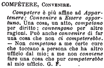 | Competere, Convenire - Competere è più affine ad Appartenere; Convenire a Essere opportuno. Una cosa, un atto, competono per diritto: convengono per altre ragioni. Può anche convenire di far una cosa che non ci competerebbe. - Non competono a me certe cure che toccano a persona che ha altro ufficio dal mio; a me non conviene fare una cosa che pur competerebbe al mio ufficio. G.F. [immagine] |