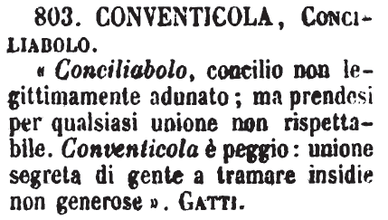 | Conventicola, Conciliabolo - «Conciliabolo, concilio non legittimamente adunato; ma prendesi per qualsiasi unione non rispettabile. Conventicola è peggio: unione segreta di gente a tramare insidie non generose». Gatti. [immagine] |
