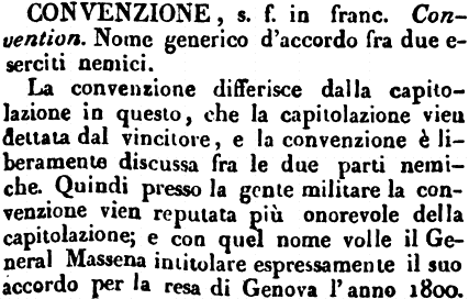 La convenzione differisce dalla capitolazione in questo, che la capitolazione vien dettata dal vincitore, e la convenzione è liberamente discussa fra le due parti nemiche. Quindi presso la gente militare la convenzione vien reputata più onorevole della capitolazione; e con quel nome volle il General Massena intitolare espressamente il suo accordo per la resa di Genova l'anno 1800. [immagine] |