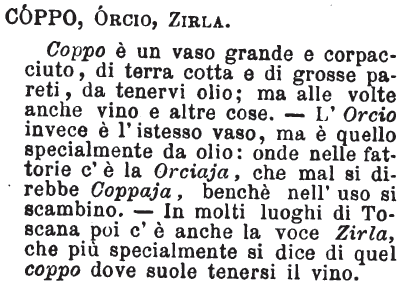 | Coppo, Orcia, Zirla - Coppo è un vaso grande e corpacciuto, di terra cotta e di grosse pareti, da tenervi olio; ma alle volte anche vino e altre cose. - L'Orcio invece è l'istesso vaso, ma è quello specialmente da olio: onde nelle fattorie c'è la Orciaja, che mal si direbbe Coppaja, benchè nell'uso si scambino. - In molti luoghi di Toscana poi c'è anche la voce Zirla, che più specialmente si dice di quel coppo dove suole tenersi il vino. [immagine] |