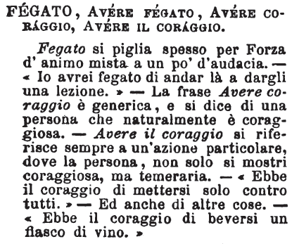 | Fegato, Avere fegato, Avere coraggio, Avere il coraggio - Fegato si piglia spesso per Forza d'animo mista a un po' d'audacia. - «Io avrei fegato di andar là a dargli una lezione.» - La frase Avere coraggio è generica, e si dice di una persona che naturalmente è coraggiosa. - Avere il coraggio si riferisce sempre a un'azione particolare, dove la persona, non solo si mostri coraggiosa, ma temeraria. - «Ebbe il coraggio di mettersi solo contro tutti.» - Ed anche di altre cose. - «Ebbe il coraggio di beversi un fiasco di vino.» [immagine] |