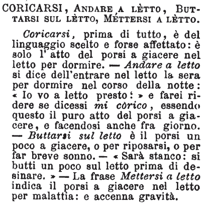 | Coricarsi, Andare a letto, Buttarsi sul letto, Mettersi a letto - Coricarsi, prima di tutto, è del linguaggio scelto e forse affettato: è solo l'atto del porsi a giacere nel letto per dormire. - Andare a letto si dice dell'entrare nel letto la sera per dormire nel corso della notte: «Io vo a letto presto;» e farei ridere se dicessi mi còrico, essendo questo il puro atto del porsi a giacere, e facendosi anche fra giorno. - Buttarsi sul letto è il porsi un poco a giacere, o per riposarsi, o per far breve sonno. - «Sarà stanco: si butti un poco sul letto prima di desinare.» - La frase Mettersi a letto indica il porsi a giacere nel letto per malattia: e accenna gravità. [immagine] |
