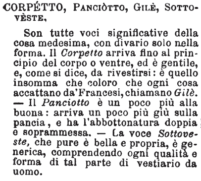 | Corpetto, Panciotto, Gilè, Sottoveste - Son tutte voci significative della cosa medesima, con divario solo nella forma. Il Corpetto arriva fino al principio del corpo o ventre, ed è gentile, e, come si dice, da rivestirsi: è quello insomma che coloro che ogni cosa accattano da' Francesi, chiamano Gilè. - Il Panciotto è un poco più alla buona: arriva un poco più giù sulla pancia, e ha l'abbottonatura doppia e soprammessa. - La voce Sottoveste, che pure è bella e propria, è generica, comprendendo ogni qualità e forma di tal parte di vestiario da uomo. [immagine] |