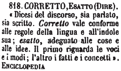 | Corretto, Esatto (Dire) - « Dicesi del discorso, sia parlato, sia scritto. Corretto vale conforme alle regole della lingua e all'indole sua; esatto, adeguato alle cose e alle idee. Il primo riguarda le voci e i modi; l'altro i fatti e i concetti ». Enciclopedia [immagine] |