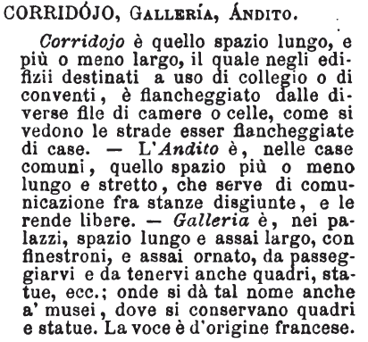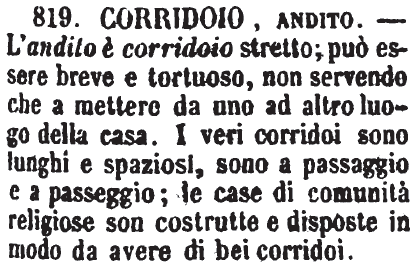 | Corridoio, Andito - L'andito è corridoio stretto; può essere breve e tortuoso, non servendo che a mettere da uno ad altro luogo della casa. I veri corridoi sono lunghi e spaziosi, sono a passaggio e a passeggio; le case di comunità religiose son costrutte e disposte in modo da avere di bei corridoi. [immagine] |